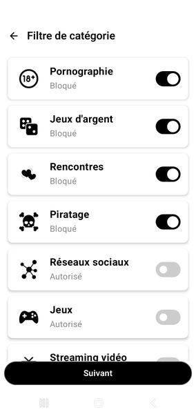 Sélectionnez les catégories qui seront bloquées ou autorisées dans les navigateurs.