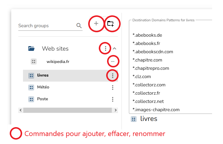 D’autre part, pour un usage particulier comme consulter la météo, il peut y avoir bien d’autres sites qu’on voudrait aussi autoriser comme météociel, météosuisse, et d’autres. Mettre tout dans la liste des domaines finit par la rendre illisible. L’utilisateur peut créer un groupe météo dans lequel il groupera les différents sites qui lui semblent intéressants dans ce domaine. Ce sont les groupes personnalisés.