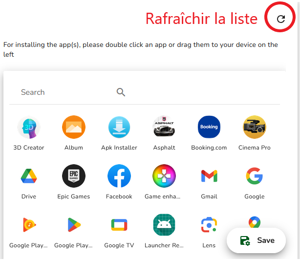 Le bouton « Rafraîchr » est utilisé lors de l’installation d’une nouvelle application.